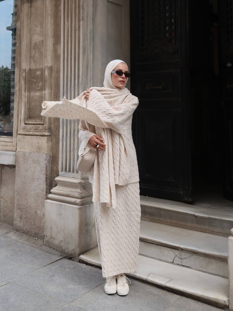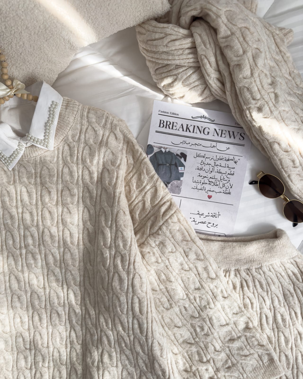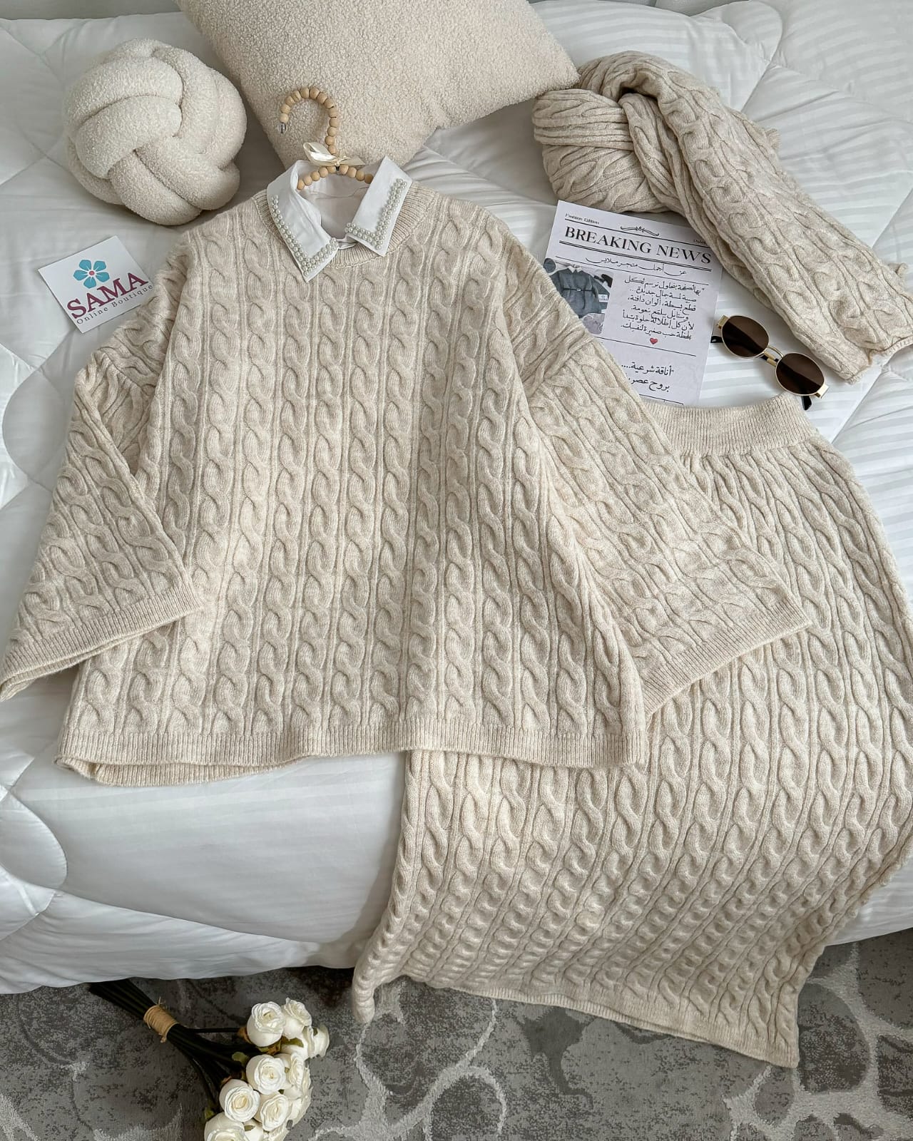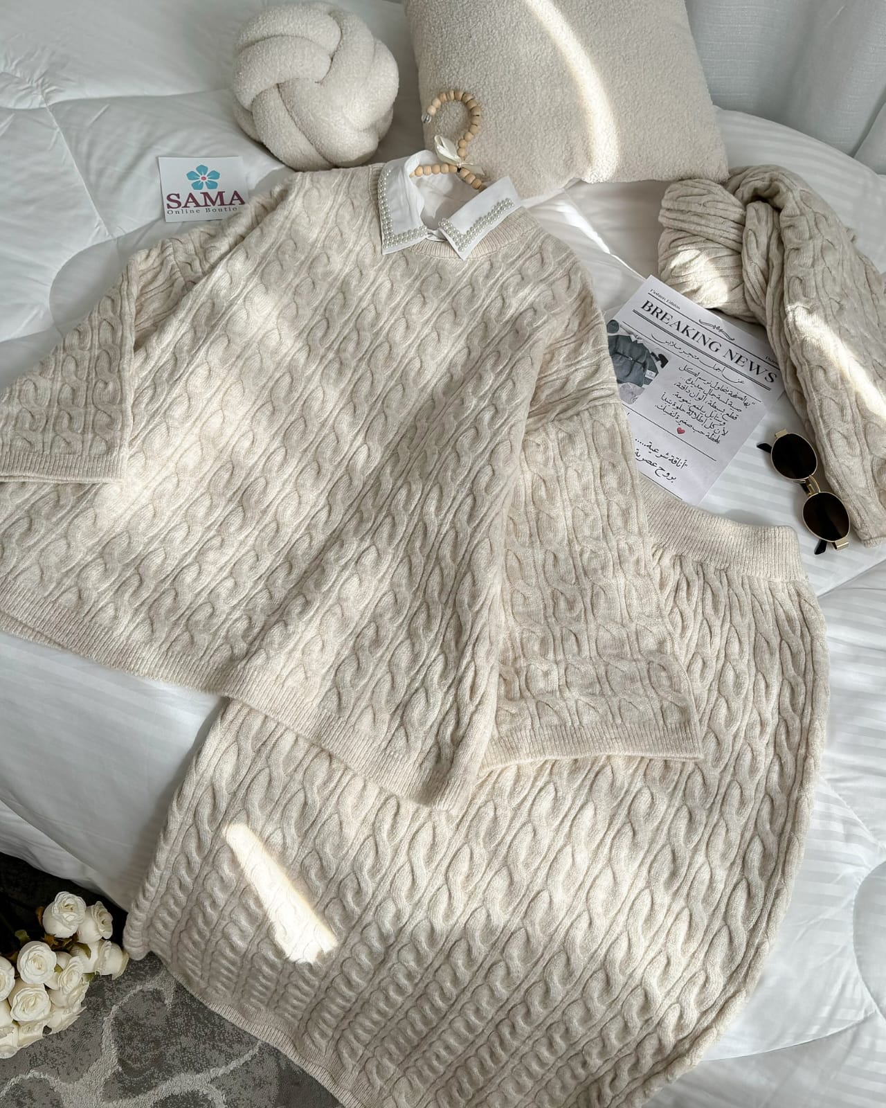 طقم صوفي شتوي أنيق مع شال مطابق، دافئ ومريح لإطلالة راقية 🤍❄️