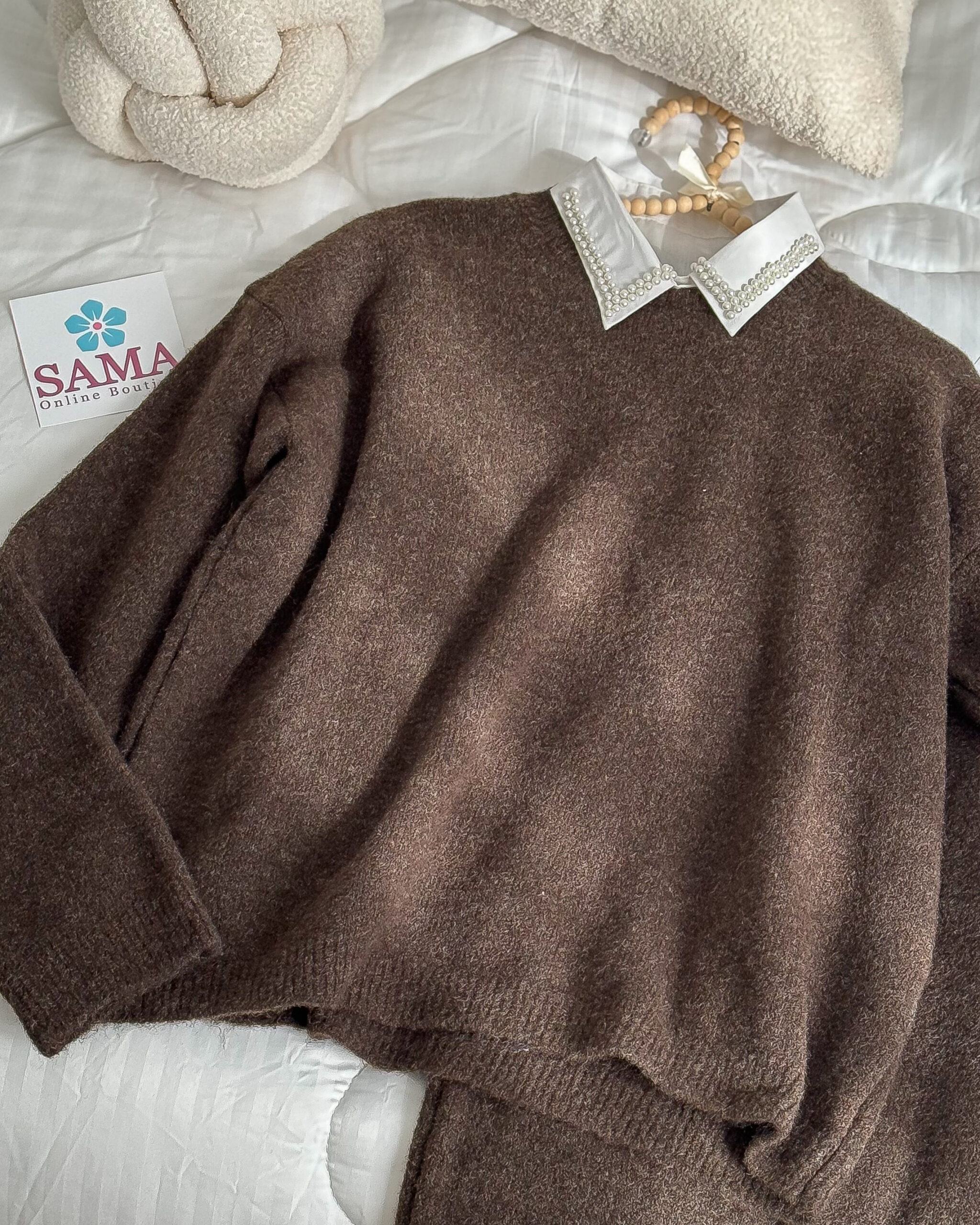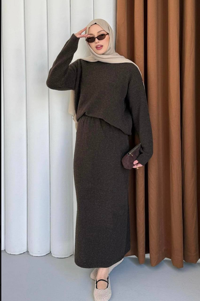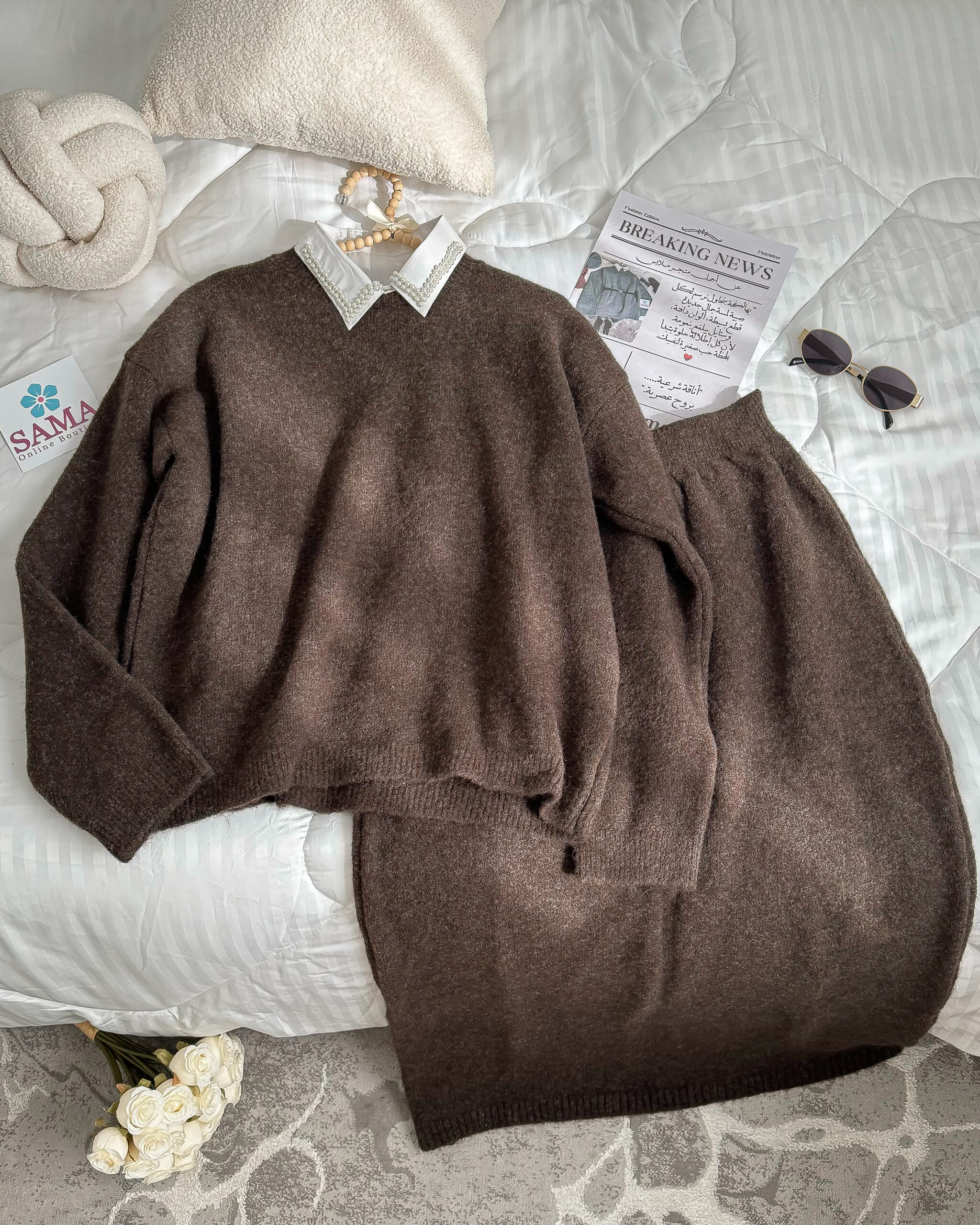 طقم صوف تنورة بني أنيق وناعم، تصميم دافئ بلمسة راقية يناسب الإطلالات اليومية والشتوية. خيار مثالي للأناقة المريحة بكل بساطة 🤎✨