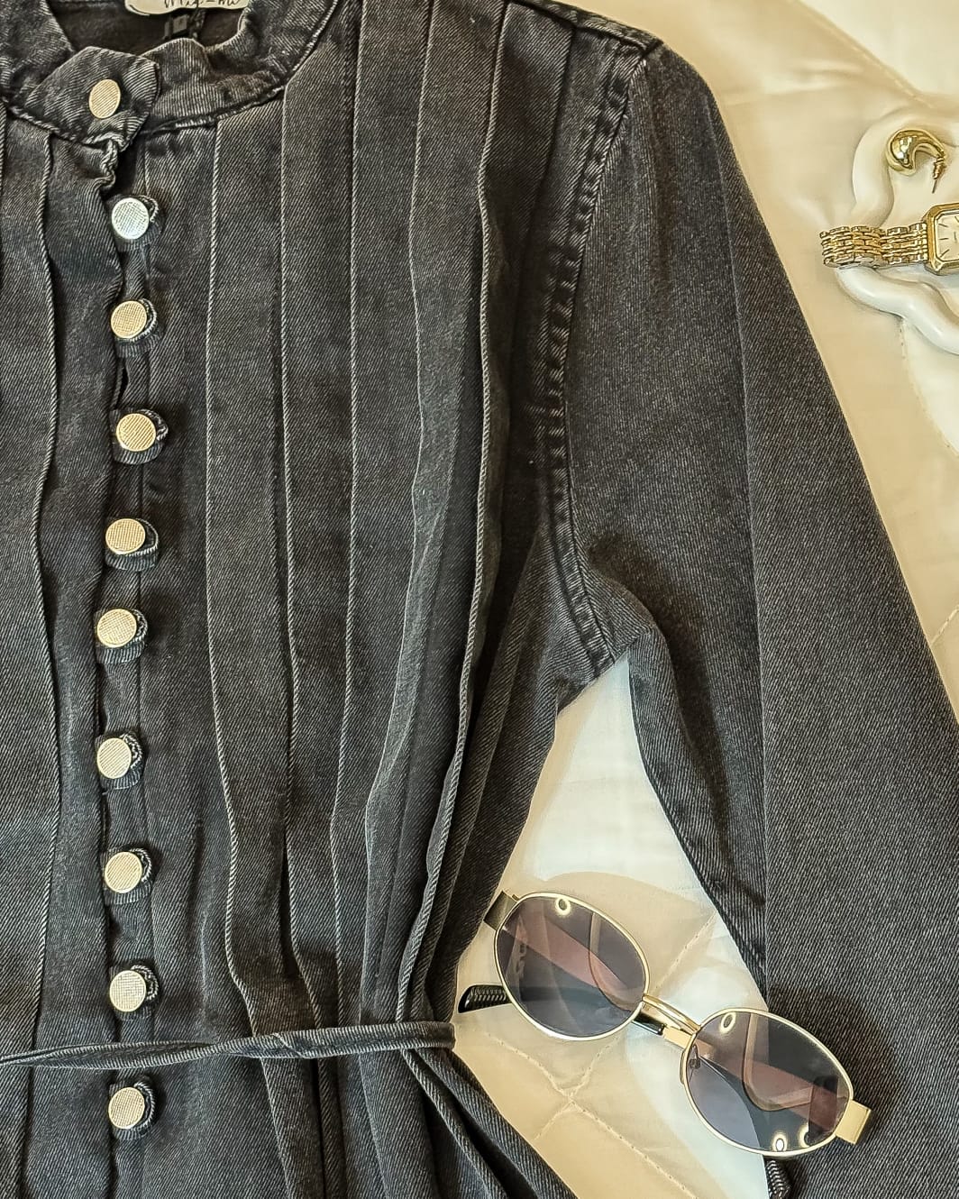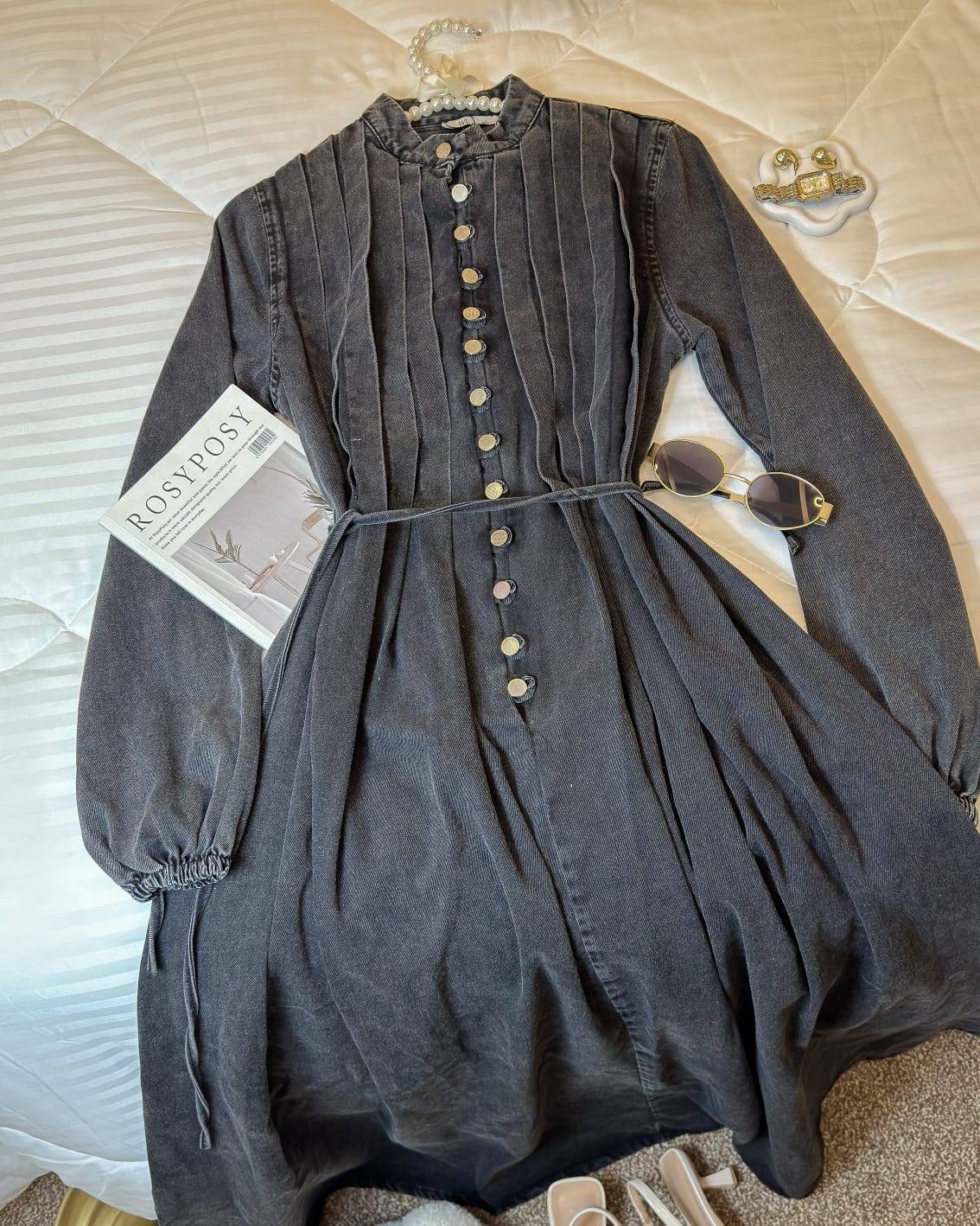 فستان جينز طويل ومحتشم مع حزام عالخصر، مناسب للأجواء الخريفية.