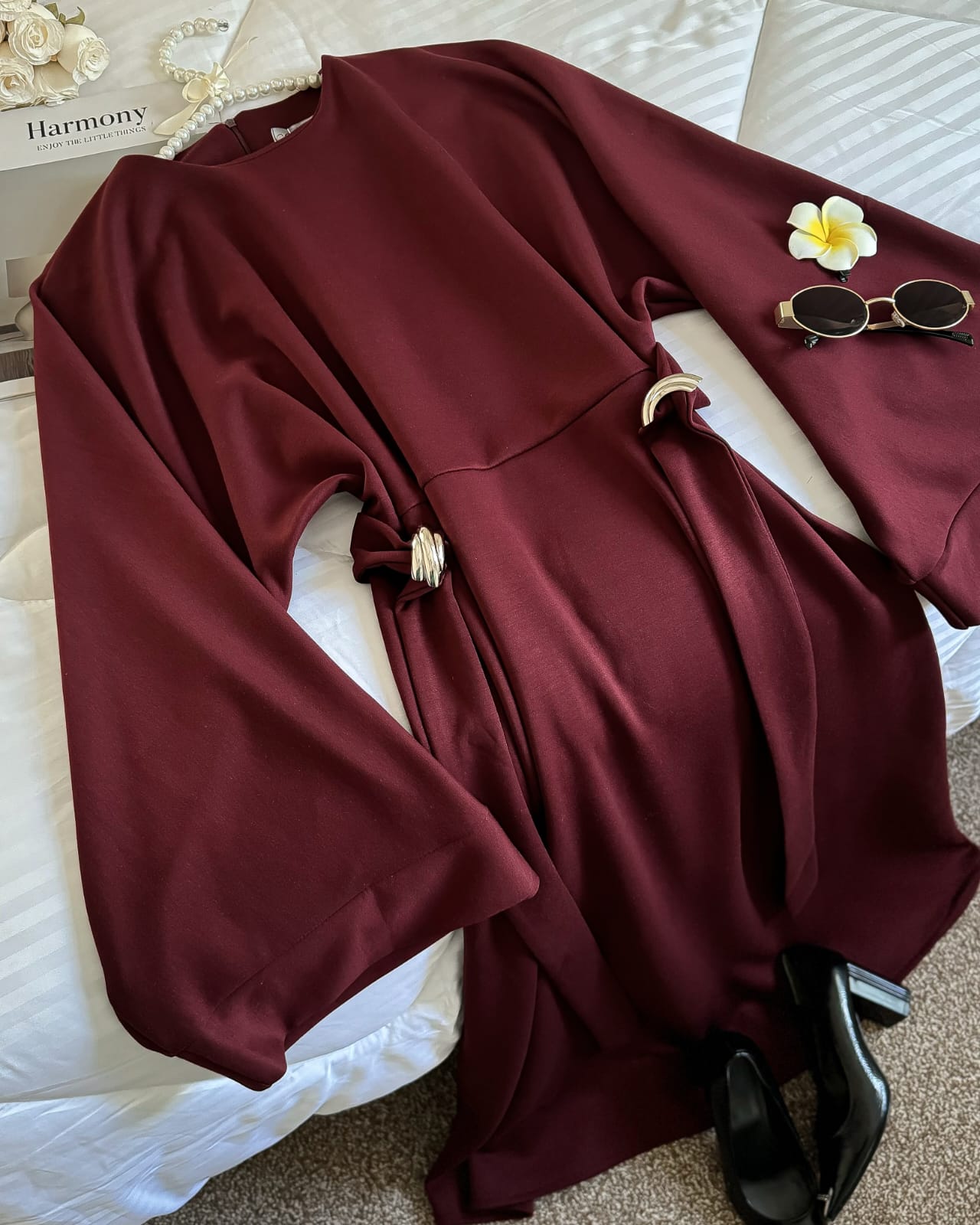 فستان خريفي بقماش القطن مع حزام طويل مميز، مناسب للأجواء الخريفية الباردة.