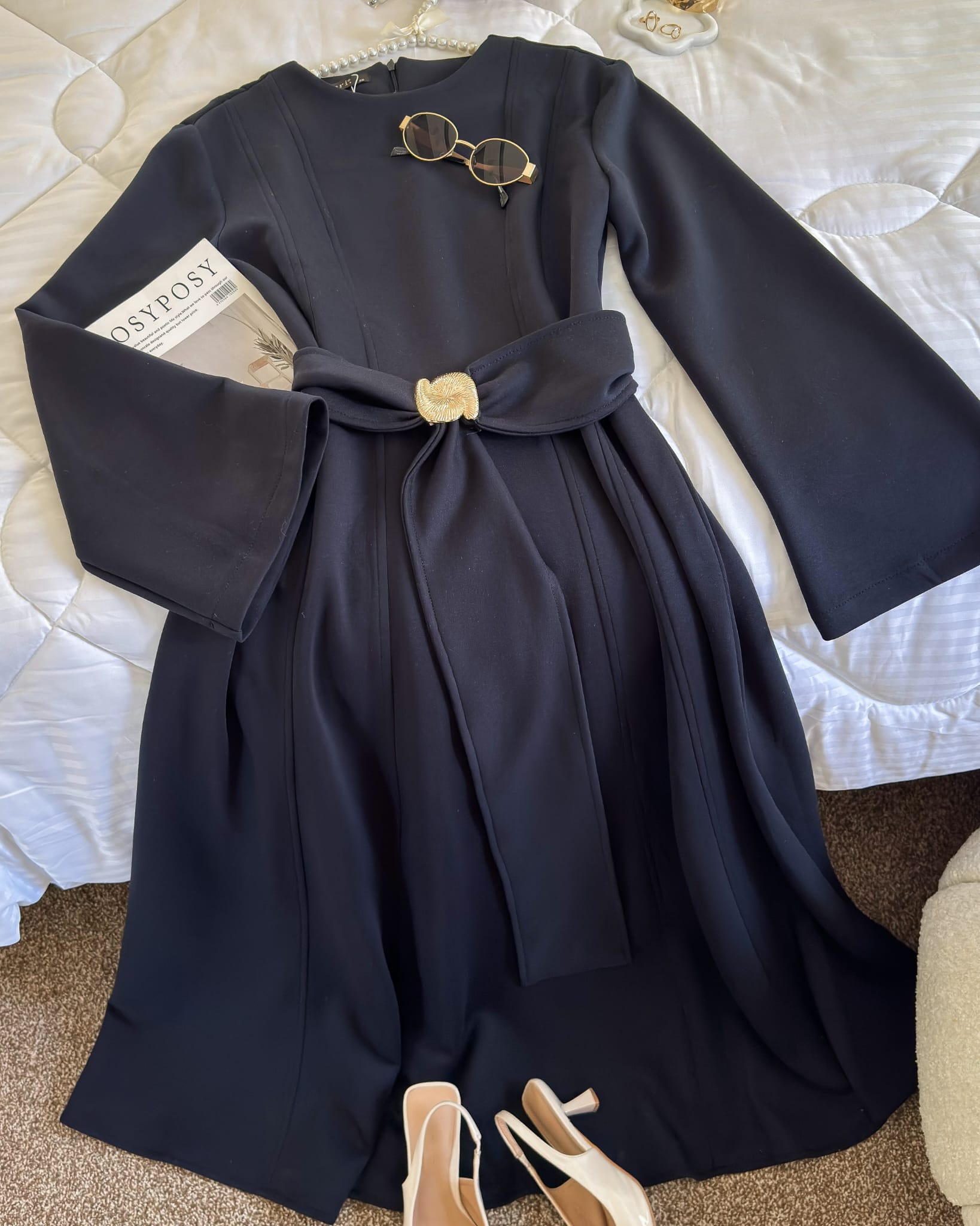 فستان أنيق بتصميم محتشم وحزام يبرز الخصر، مصنوع من قماش قطن–سكوبا مريح لإطلالة راقية تناسب يومك ومناسباتك.