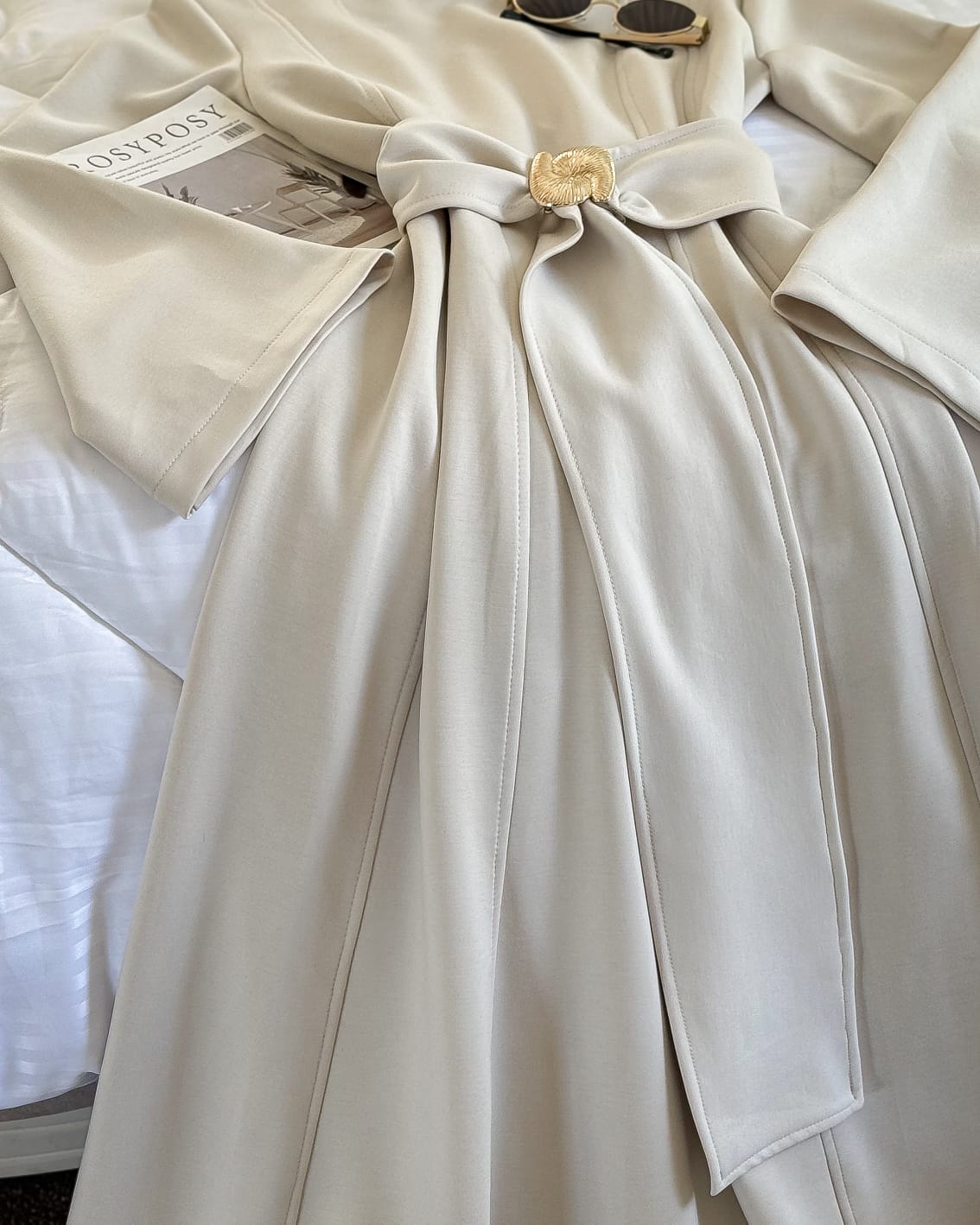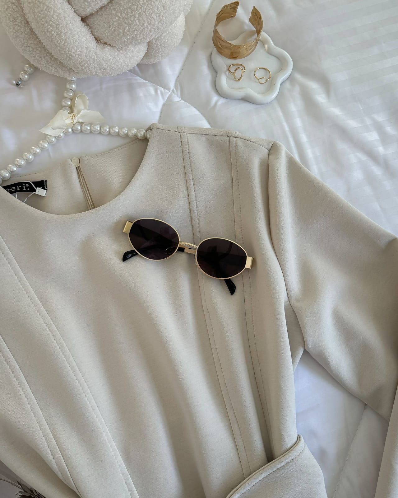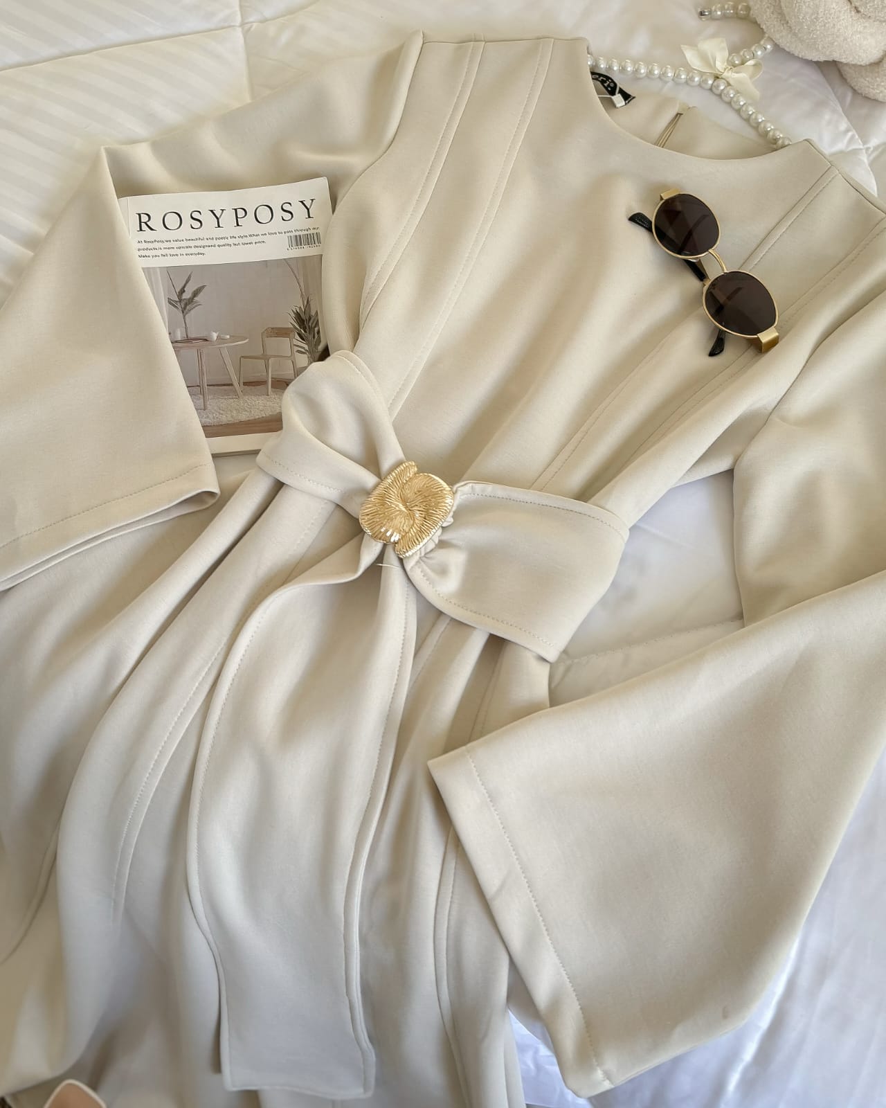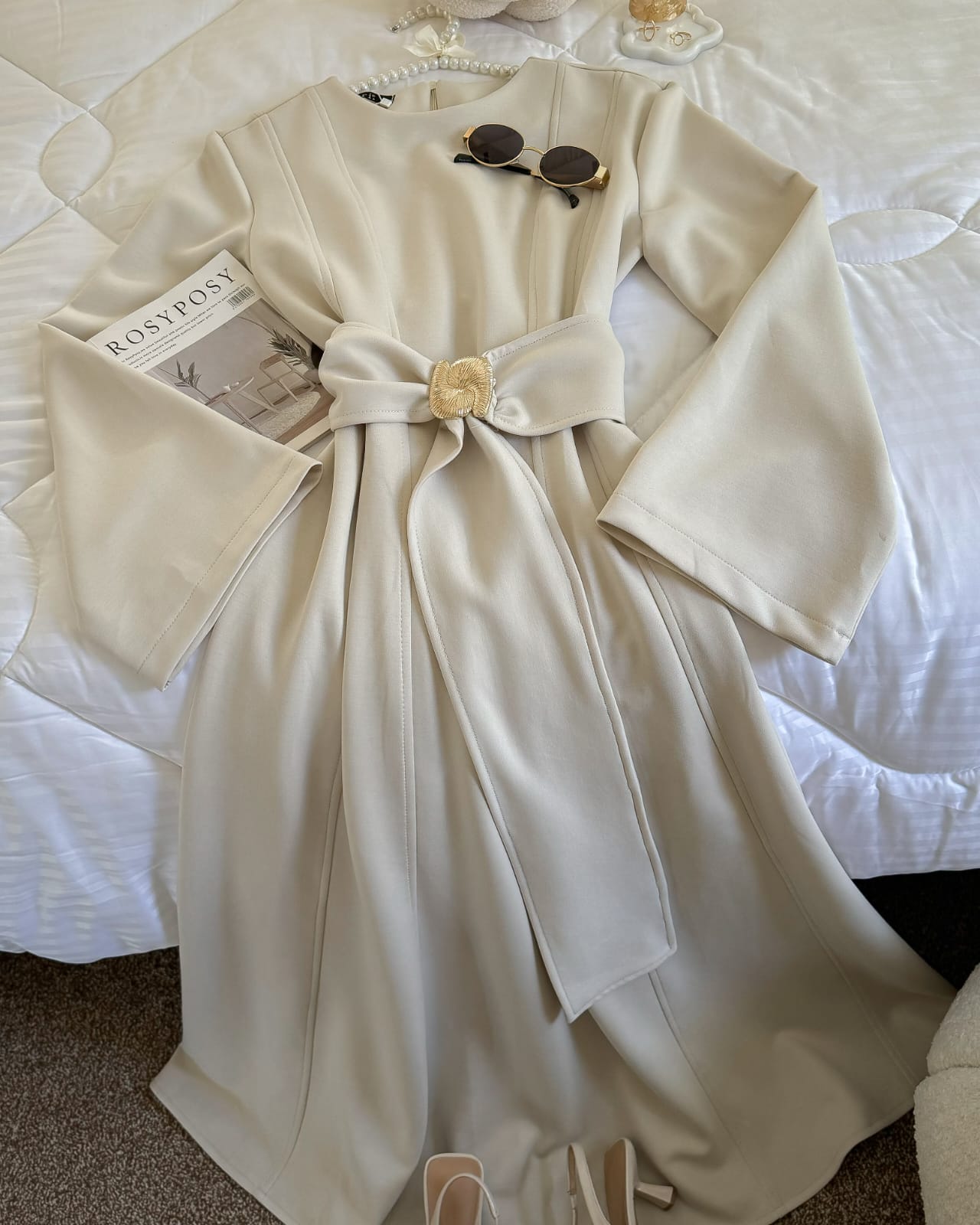 فستان محتشم أنيق، بتصميم انسيابي مع حزام يحدد الخصر، مصنوع من قماش قطن–سكوبا مريح، مثالي لإطلالة راقية يومية أو للمناسبات.