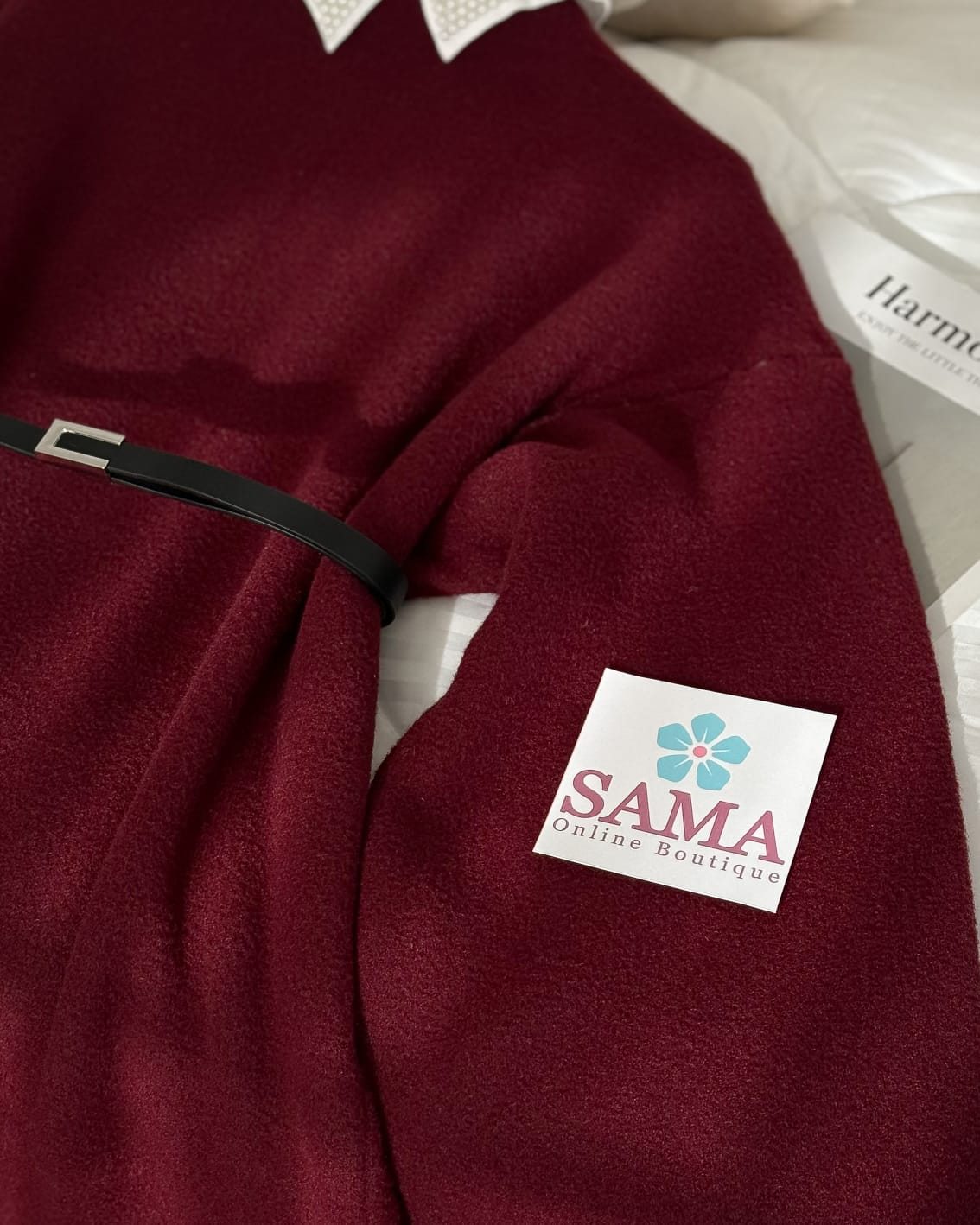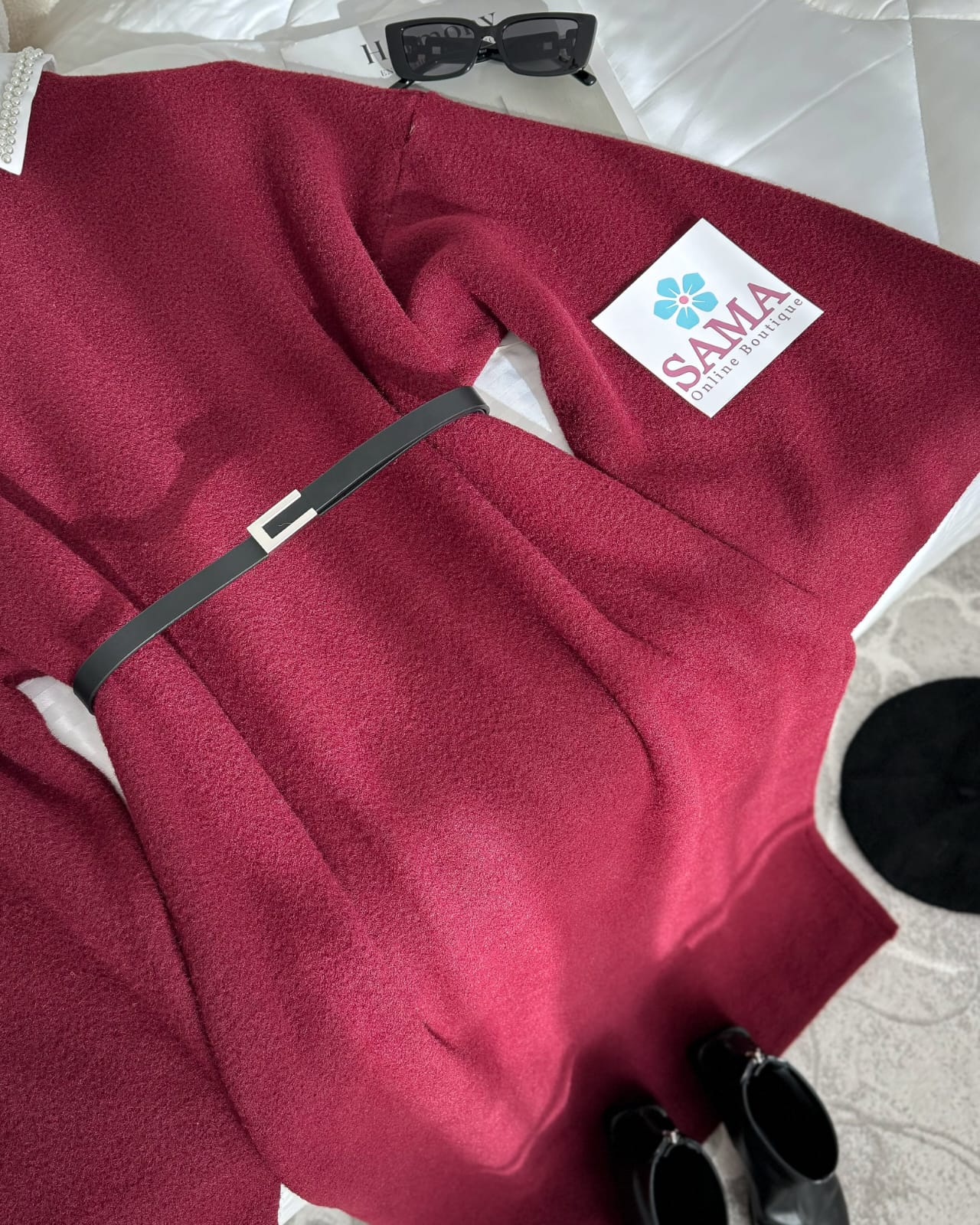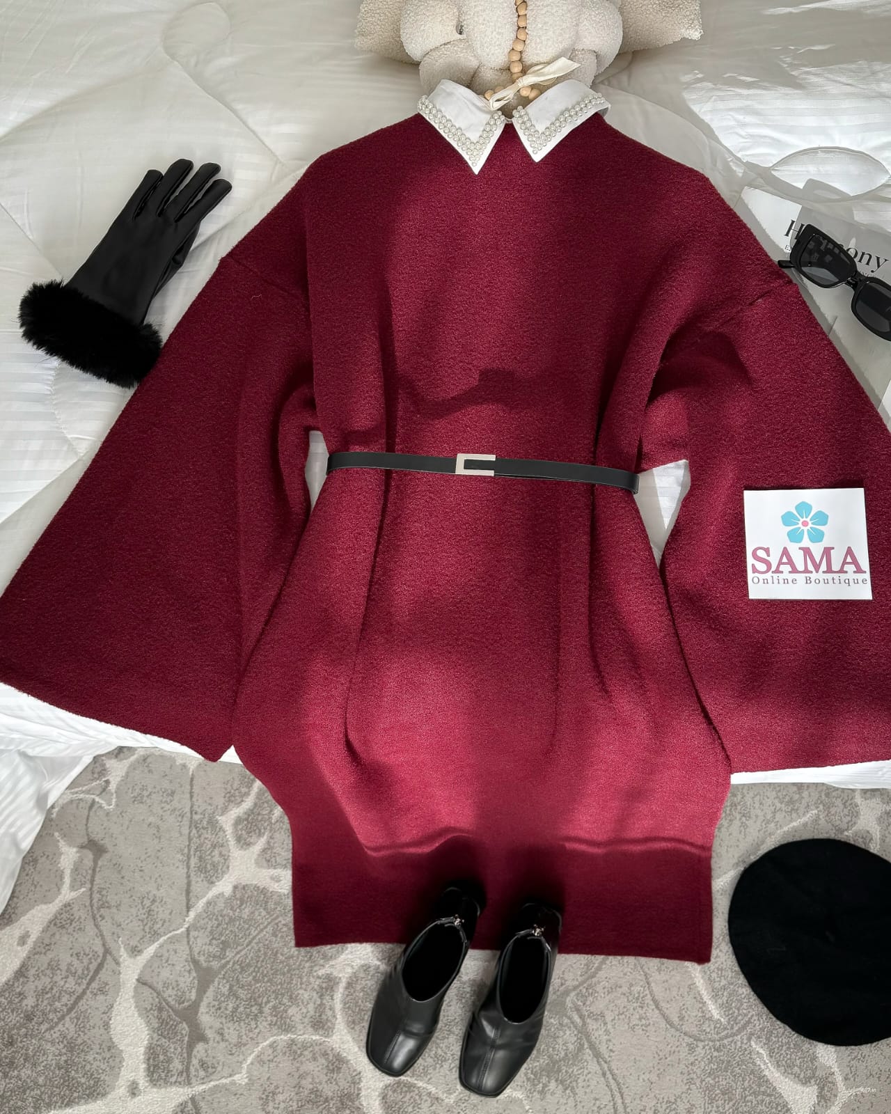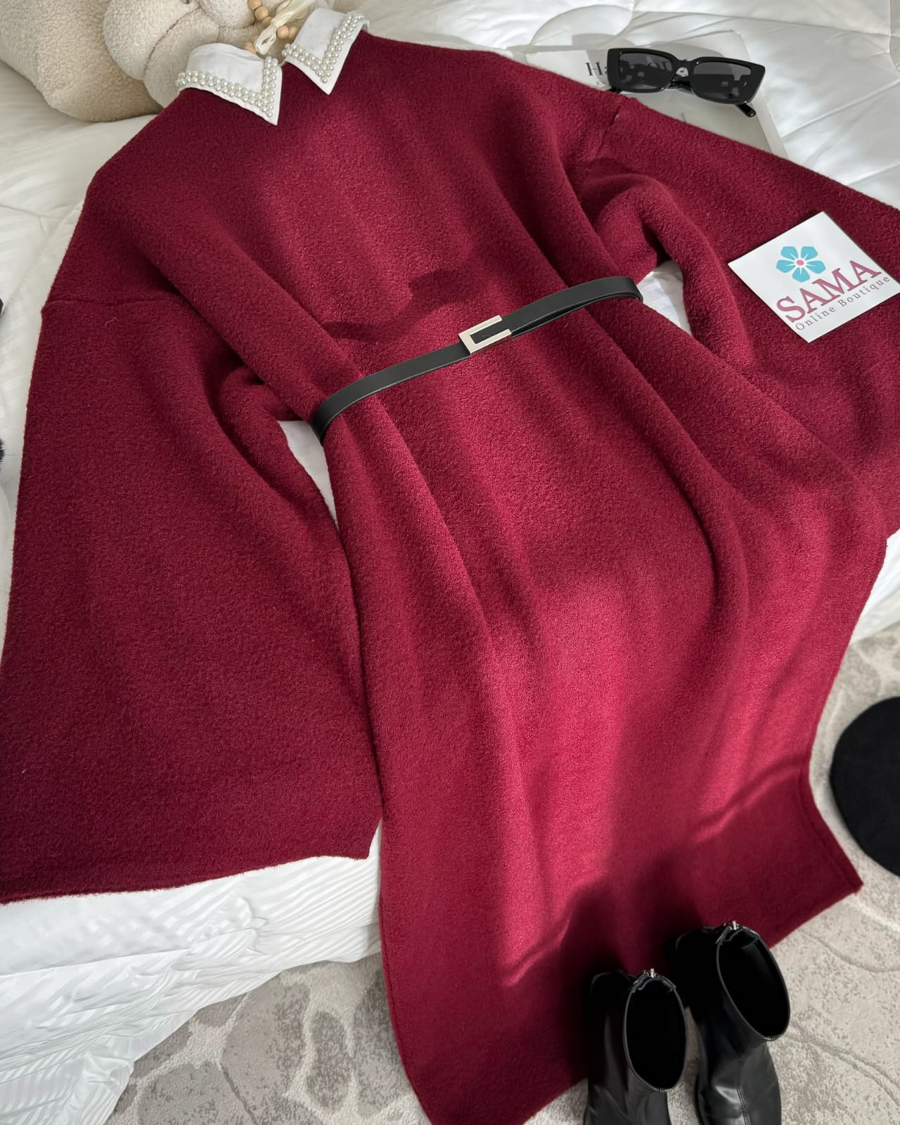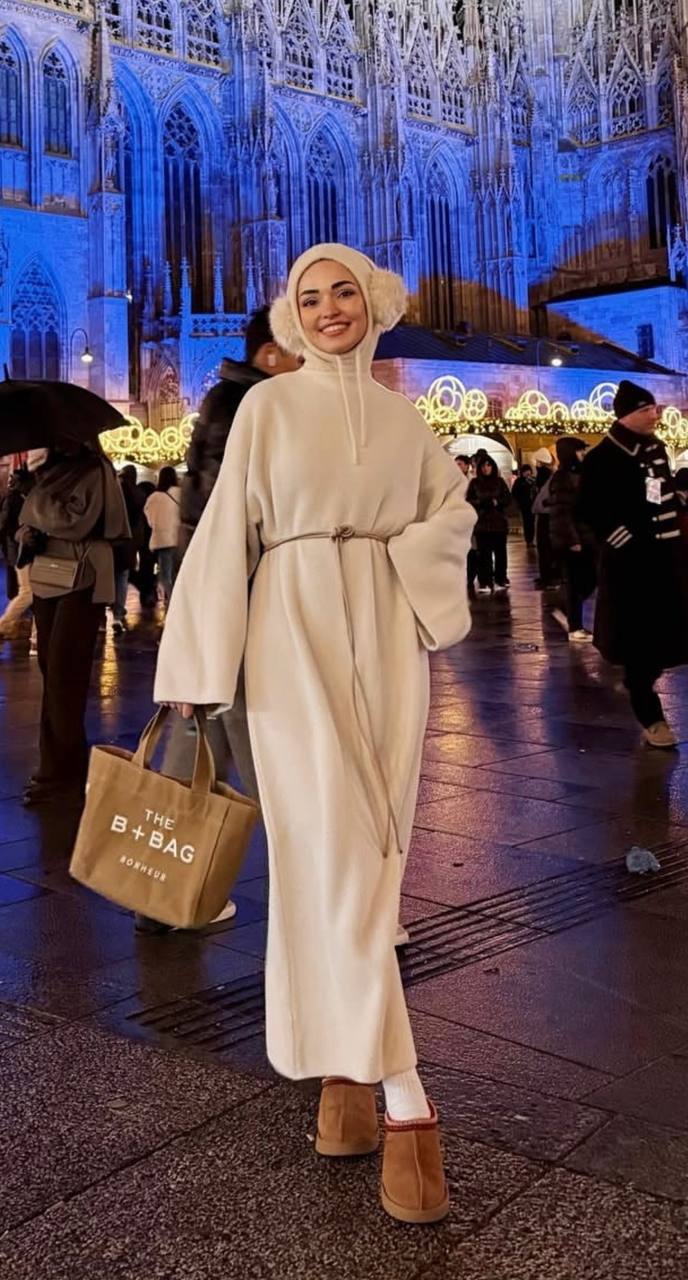 فستان صوف طويل خمري مناسب للأجواء الباردة.